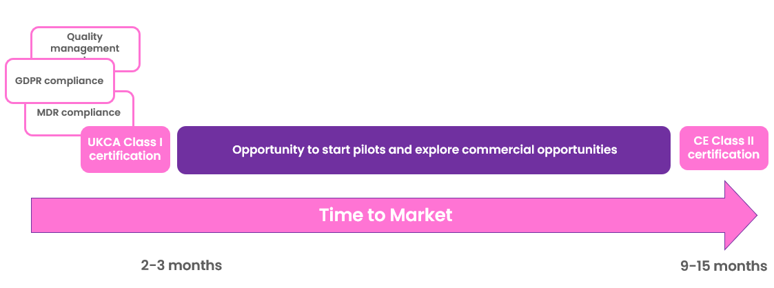 A UKCA mark can be obtained in a short time (1-6 months) and you can start pilots and explore commercial opportunities sooner with a registered medical device. You have the option to register for a clinical investigation of unregistered medical devices in the UK prior to CE approval, but this introduces a level of complexity and reduces the speed at which you can execute on pilot opportunities.
